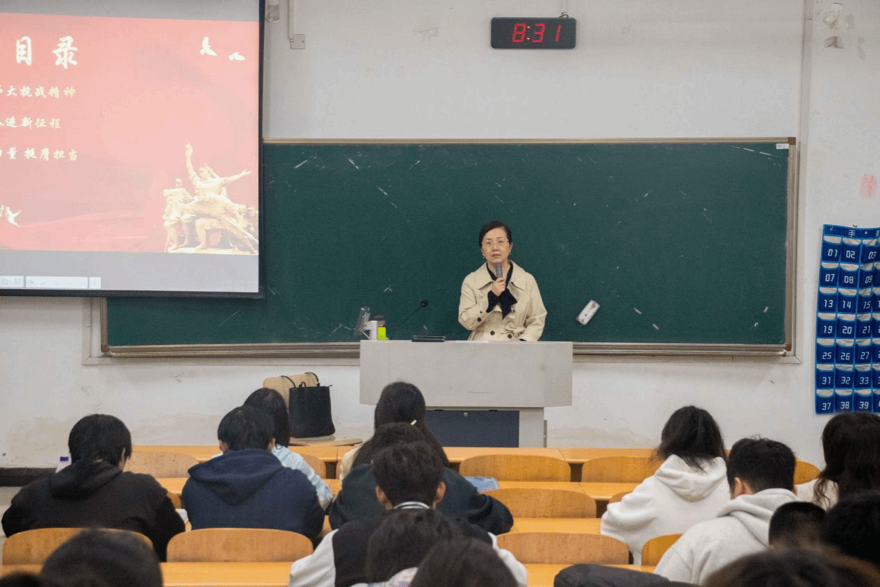 首场讲座以“纪念中国人民抗日战争暨世界反法西斯战争胜利80周年”为主题。尹剑老师以电影《南京照相馆》为引,深情回溯了中国人民抗日战争那段艰苦卓绝的岁月,深刻阐释了抗战精神作为中华民族宝贵精神财富的核心内涵。讲座从历史、当下、未来三个维度展开,引导同学们在回望烽火岁月中感悟历史厚重,在缅怀先烈中珍惜和平来之不易,激励大家从抗战精神中汲取奋进力量。