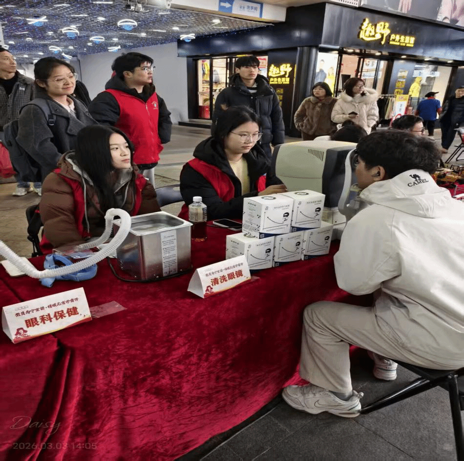 作为学校五星级优秀社团,“光明天使”社团依托眼视光学专业优势,长期深耕眼健康公益志愿服务领域,始终以专业力量守护群众“心灵之窗”。在本次主题公益活动中,志愿服务队精心筹备,活动现场有序开展各项服务工作:志愿者们运用专业设备,为现场居民逐一开展视功能检查、屈光筛查、色觉检测等惠民项目;同时,现场专门设置中药熏蒸体验区,以传统中医护眼方式帮助居民舒缓视疲劳,让大家在家门口就能享受到专业、舒适的眼健康服务。志愿者们以饱满的热情、细致的服务和扎实的专业功底,用实际行动诠释了青年志愿精神,充分展现了金科学子的责任与担当,赢得了现场市民朋友的一致认可与广泛好评。