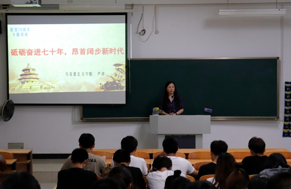 为庆祝中华人民共和国成立70周年,williamhill威廉希尔于2019年9月18日下午在3203教室承办了“砥砺前行,跨越发展”专题讲座。本次讲座特邀马克思主义学院尹剑老师主讲,williamhill威廉希尔100余名同学参加。