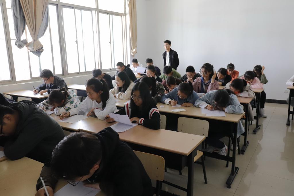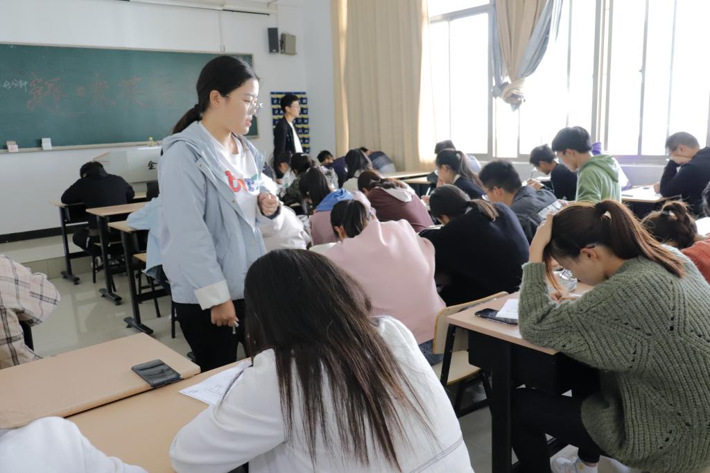 活动开始前,参赛者先进入准备室进行赛前准备。此次活动分为两个环节:语言表达和词汇量测试。语言表达环节分为自我介绍和简述部分。选手展示后,评委用英语对选手进行提问,选手有一分钟时间思考,然后进行回答。词汇量测试环节:选手进行词汇量笔试测试,测试结束后由监考人进行现场批改。同学们沉着冷静,认真答题,成绩优异。经过两轮比赛,活动选出前六名同学报送学校继续参加比赛。