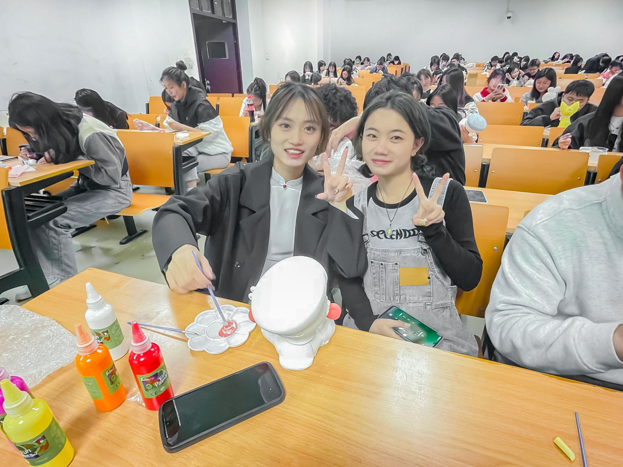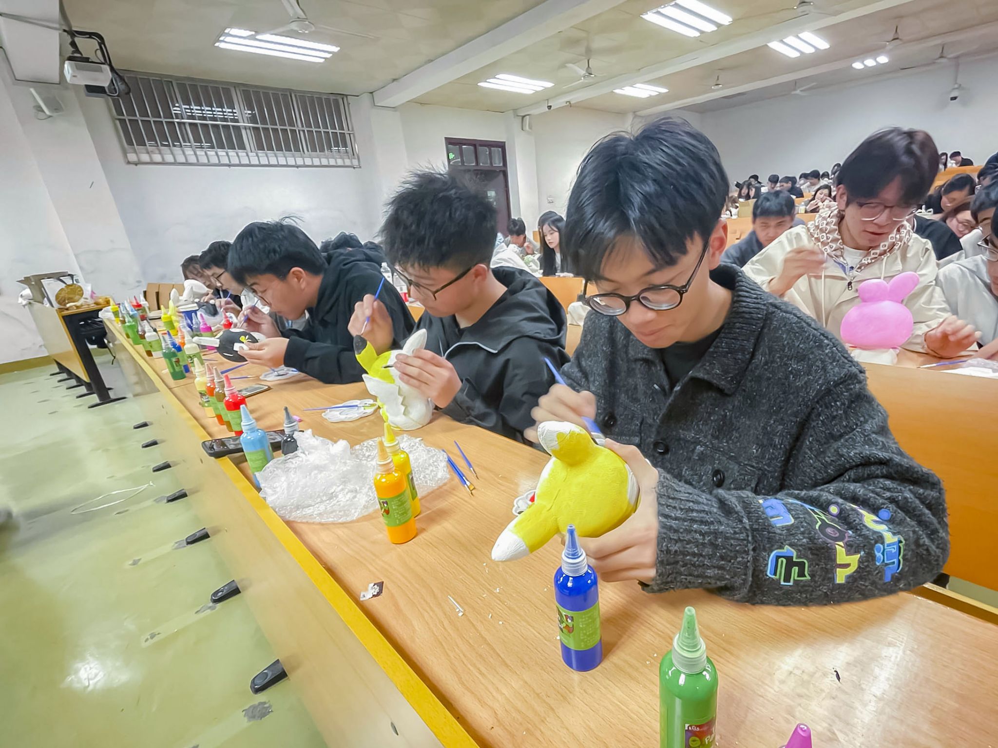 活动现场井然有序又热闹非凡,同学们纷纷挑选喜欢的颜料与石膏,兴致勃勃地准备发挥自己的奇思妙想。科技部对本次活动做了简单的介绍和指导,接着同学们便有序地开始了各自的创作。此次活动分为了大石膏组和小石膏组,小石膏组的同学们独自完成,大石膏组的同学们则是两两合作。在各组经过简单的讨论交流后,大家纷纷拿起了手中的画笔,用鲜艳明亮的色彩表达自己的创意与想法,一笔一画地勾勒手中的石膏娃娃。经过同学们认真的创作,一个个色彩丰富、栩栩如生、独一无二的娃娃相继出现,大家用天马行空的想象力赋予了这些石膏娃娃全新的生命力。