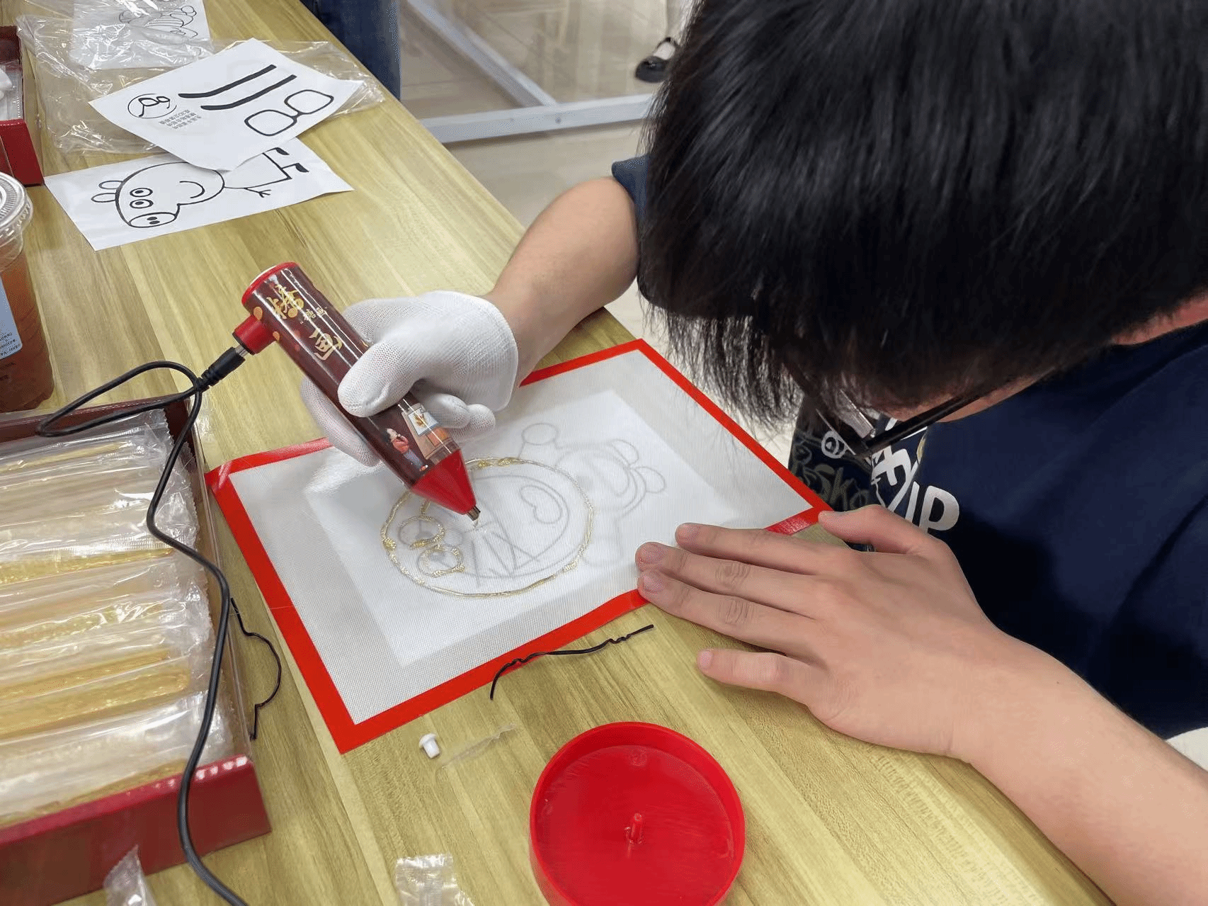 活动伊始,组织部部长魏怡帆同学为在场师生详细讲述了糖画这一国家级非物质文化遗产的历史渊源,从唐代 "糖丞相" 的雏形到明清时期的市井流行,勾勒出千年传承的文化脉络。她还现场展示了糖画制作的全套工具:灵巧的糖画笔、琥珀色的麦芽糖、光洁的亚克力画板,让大家直观感受传统工艺的精巧。随后开始了实践体验环节,师生们纷纷化身为 "非遗传承人",手持糖画笔,在温热的画板上展开创意之旅。尽管初次尝试时手法略显生涩,但热情丝毫不减——有的同学专注地勾勒出振翅欲飞的蝴蝶,翅膀上的纹路清晰可见;有的则大胆创新,创作出自行车、眼镜等现代元素与传统工艺结合的独特造型。现场气氛热烈,欢声笑语此起彼伏,在师生的相互交流与协作中,一幅幅充满巧思的糖画作品相继诞生,甜蜜的气息弥漫在整个活动的现场。
