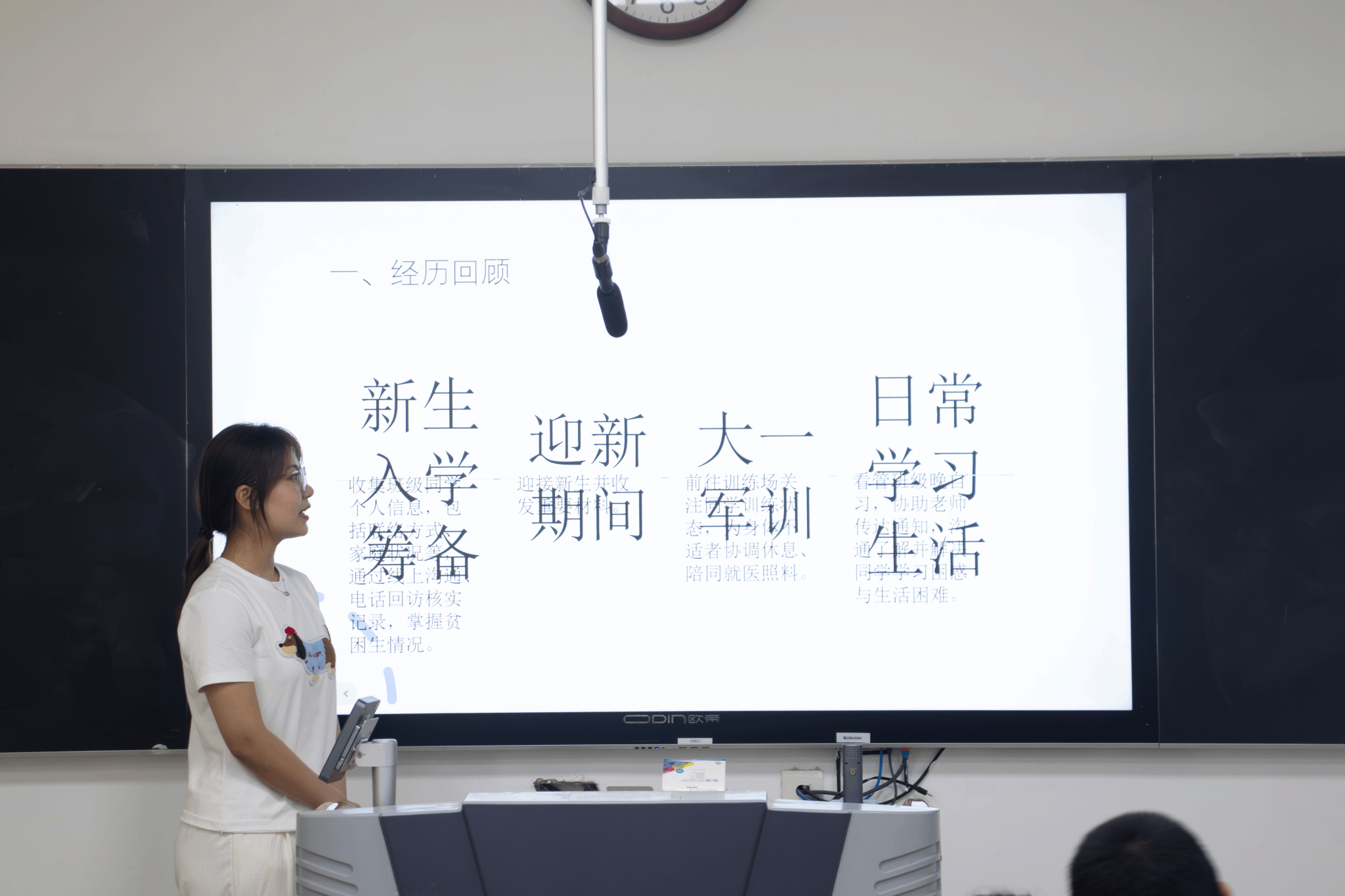 述职环节中,18位辅导员助理依次上台,围绕新生报到服务、军训组织协调、入学教育策划、班委选拔指导、学业帮扶体系构建、晚自习管理模式创新等核心工作模块,系统阐述一年来的工作。他们结合具体案例分析工作亮点,如通过学业帮扶机制帮助新生提升成绩、开展团建活动增强班级凝聚力等,同时深刻剖析工作中存在的沟通效率有待提升、应急事件处理经验不足等问题。汇报中,辅导员助理们多次提及在服务新生过程中实现的自我蜕变:从初任时的紧张青涩到如今的从容有序,从单一执行任务到主动思考创新,更在朝夕相处中与新生建立起亦师亦友的深厚情谊。