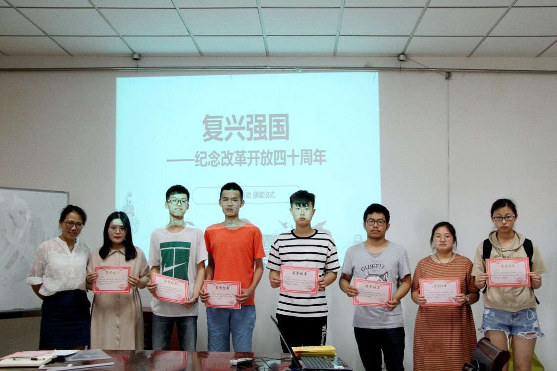 同学们踊跃投稿,大家联系自身实际,记录下身边生活的变化,讲述着改革开放的故事,用飞扬的文字描述了民族的伟大复兴之路,字里行间抒发了对祖国的热爱与祝福。经过层层选拔,李佳炜、徐浩、顾留芳等七位同学的作品脱颖而出,分获一、二、三等奖。2018年5月17日中午,颁奖仪式在工科楼会议室举行,党总支副书记陈智慧为获奖选手颁奖。