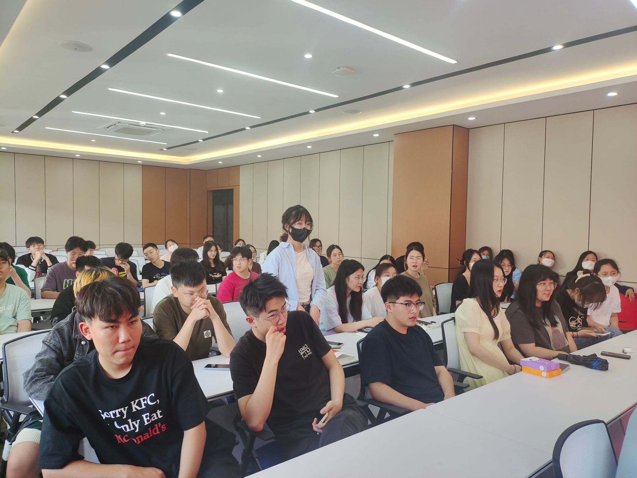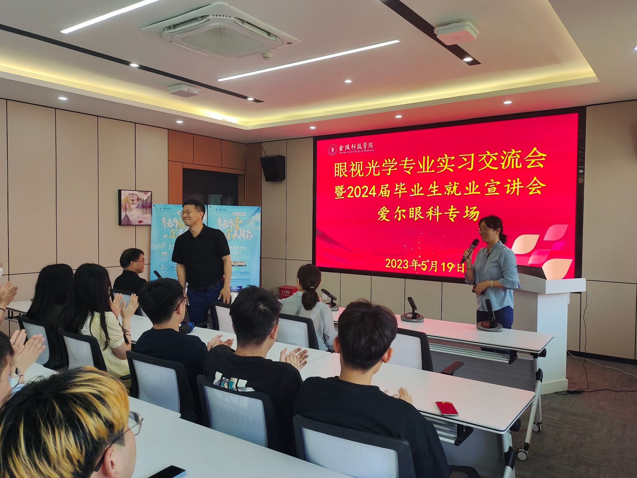 江苏爱尔眼科集团江苏省区副总CEO喻苗先生对爱尔眼科集团进行了详细介绍。他表示,多年来金科视光专业毕业生在爱尔眼科集团各岗位上发挥了非常重要的作用。希望通过本次交流会,有越来越多的金科学子加入爱尔眼科,爱尔眼科将为大家提供更多机会与平台。爱尔眼科各分支机构的人事部门负责人详细介绍了各自医院的综合实力和实习就业状况,针对就业市场的现状提供了相关指导和建议,并与学生进行了热烈的现场交流和互动。